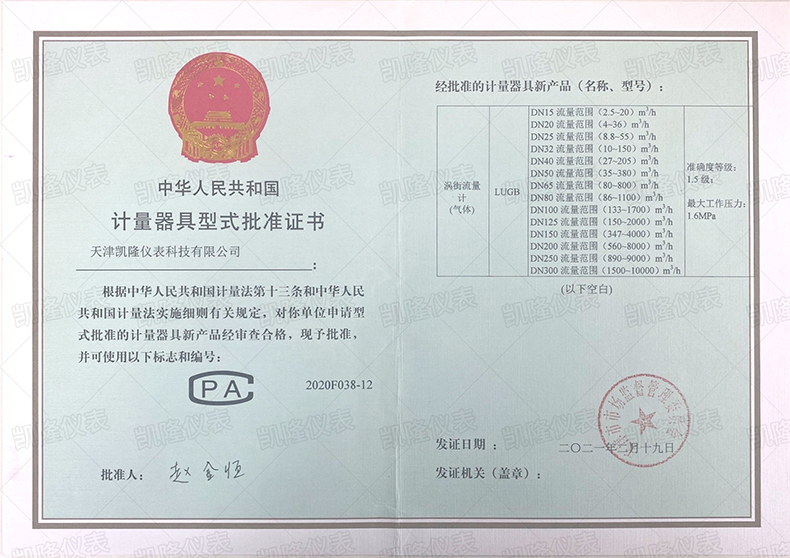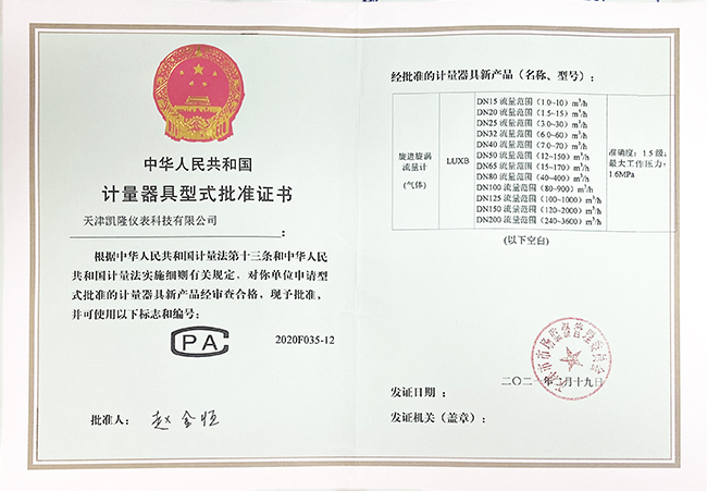 氣體腰輪流量計(jì)計(jì)量器具型式批準(zhǔn)證書