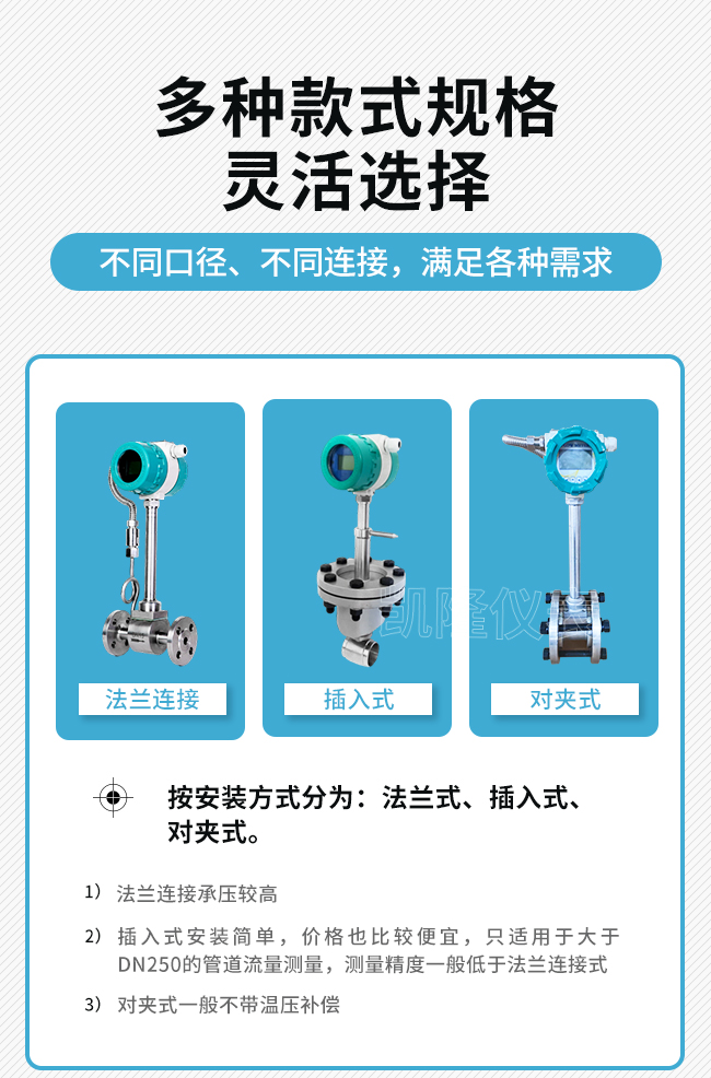 3、壓縮空氣一般管道口徑比較大,渦街口徑范圍寬,適合高流速氣體測量,有螺紋、對夾、法蘭管段式、插入式多種安裝方式可選;