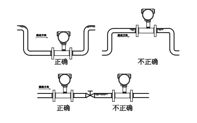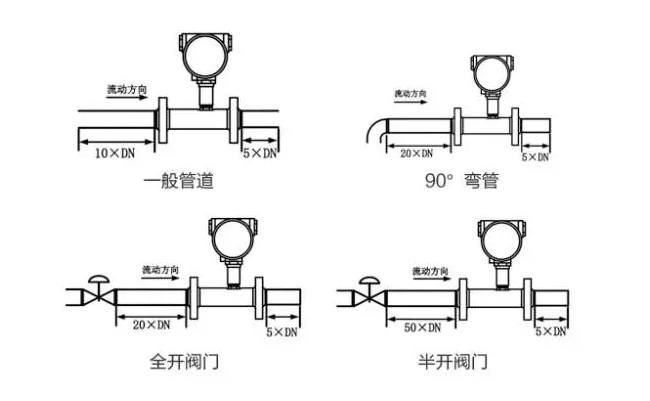 2、 安裝時液體流動方向應與傳感器外殼上指示流向的箭頭方向一致,且上游直管段應≥20dn,下游直管段應≥5dn(dn為管道內(nèi)徑)。