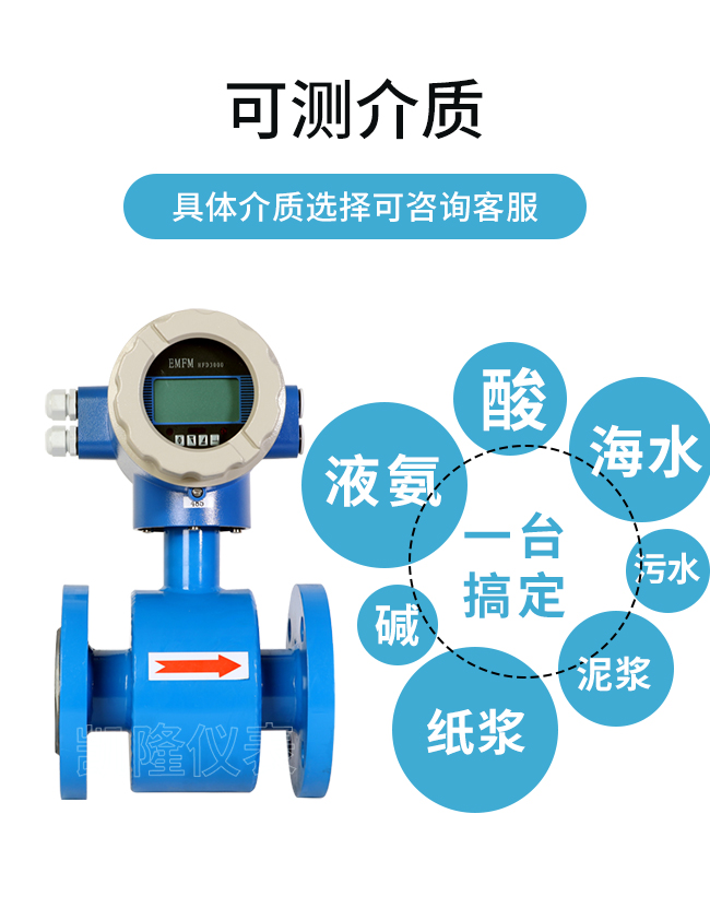 可測(cè)量介質(zhì):水、污水、鹽水、海水、空調(diào)水、消防水、循環(huán)水、硫酸、鹽酸、硝酸、醋酸、堿溶液、泥漿、紙漿、煤漿、果漿、果汁、礦泉水、飲用水、自來(lái)水、醬油、果醬、啤酒、果汁、米酒、牛奶等導(dǎo)電液體,特別適用于酸堿類(lèi)有腐蝕性的液體。