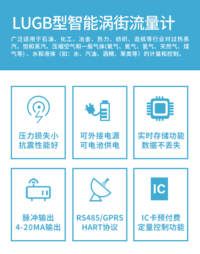 LUGB型溫壓補償渦街流量計分為一體式溫壓補償和分體式溫壓補償兩種。